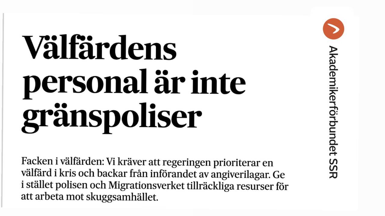 Akademikerförbundet och övriga fackförbund i Facken i välfärden skriver tillsammans på Svenska Dagbladets debattsida: Vi kräver att regeringen prioriterar en välfärd i kris och backar från införandet av angiverilagar. Ge i stället polisen och Migrationsverket tillräckliga resurser för att arbeta mot skuggsamhället.