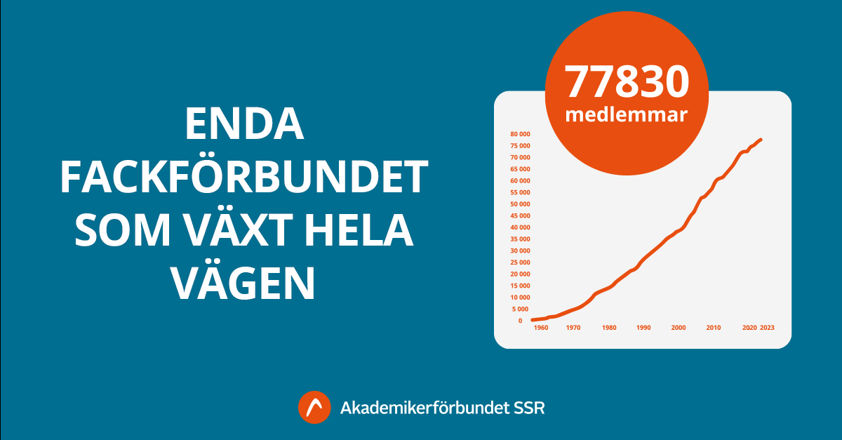 Akademikerförbundet SSR har ökat sitt medlemsantal varje år sedan vi bildades 1958, det enda fackförbund som kan visa på en obruten uppåtgående trend. 2023 ökade Akademikerförbundet SSR med 2 000 yrkesverksamma medlemmar, vid årsskiftet var det totala antalet 77 828 medlemmar, en total ökning med 3,2%.