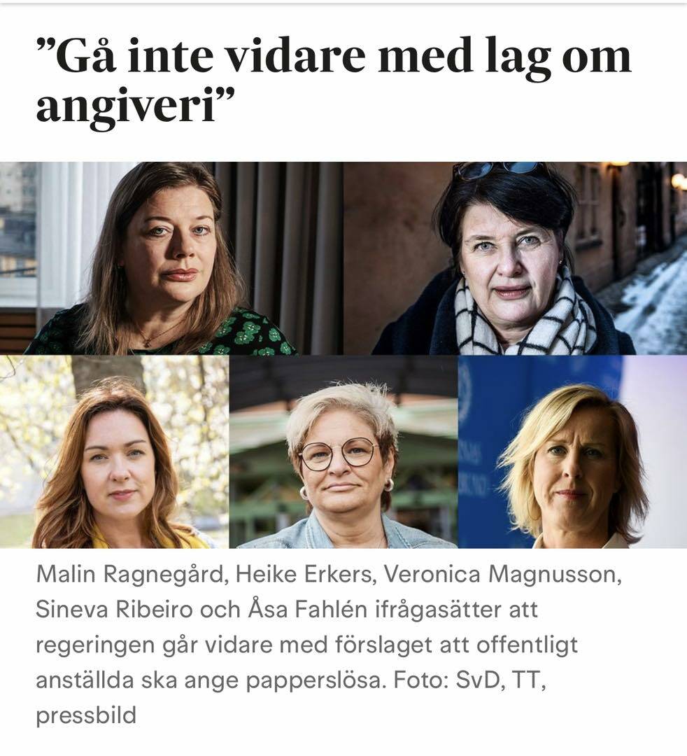 Hur är det möjligt att regeringen lyssnar mer på Sverigedemokraterna än Sveriges enade välfärdsprofessioner? Förslaget innebär att yrkesgrupper inom bland annat vård, skola och omsorg ska bli tvungna att ange papperslösa. Det kan handla om personal inom vård och omsorg som behöver anmäla patienter, lärare i skola och förskola som ska anmäla barn och elever och socialsekreterare som tvingas anmäla människor i behov av stöd och hjälp. Professioner som i högsta grad bygger sitt arbete på tillit och förtroendefulla relationer kan bli skyldiga att utföra handlingar som direkt strider mot deras yrkesetiska regler och nuvarande lagstiftning. Informationsplikten innebär att den som arbetar i välfärden får en generell skyldighet att inte bara anmäla men även att undersöka andra personers lagliga rätt att vistas i Sverige och sedan ange dem till Migrationsverket eller polismyndigheten. Det kan vi aldrig acceptera.